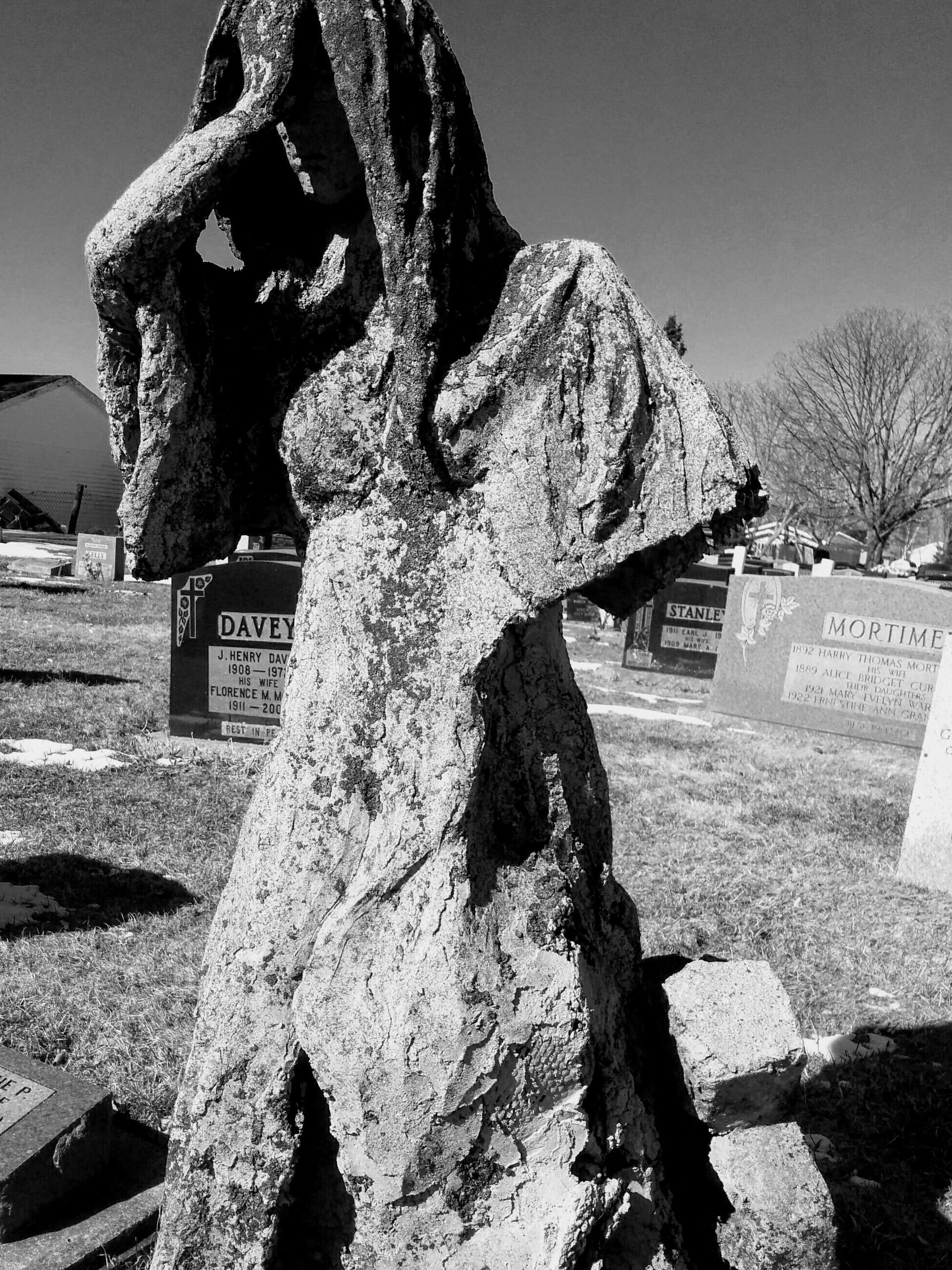 In high school (2001-2004)we used to go hang out by this stone, it was so pretty and creepy, and you could see her pain. There’s a date on her, both carved in different places, a name carved, and so etching else but I can’t remember. I was sad when I went back years later and her arm was broken and now covered in age! Still beautiful, though I know nothing of the real story